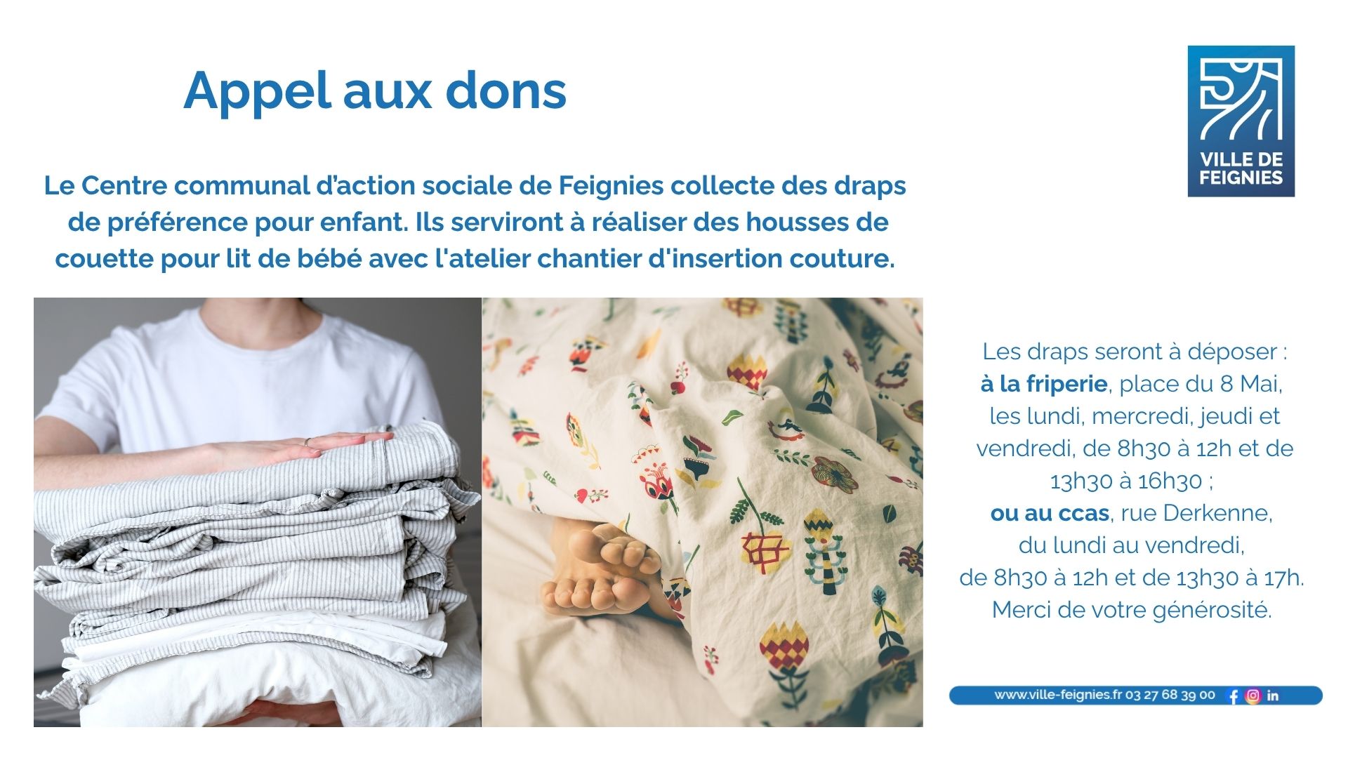 Le Centre communal d’action sociale collecte des draps si possible pour enfants dans le cadre d’un projet couture avec le chantier d’insertion. N’hésitez pas à vider vos placards pour la bonne cause !