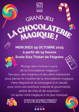 Plonge dans l’univers sucré de la Chocolaterie magique ! Des jeux, des énigmes et des défis t’attendent pour percer le mystère de la chocolaterie magique. Viens déguisé et accompagné d’un adulte pour vivre une aventure colorée et gourmande, pleine de rires et de surprises ! Un après-midi magique à ne pas manquer.
