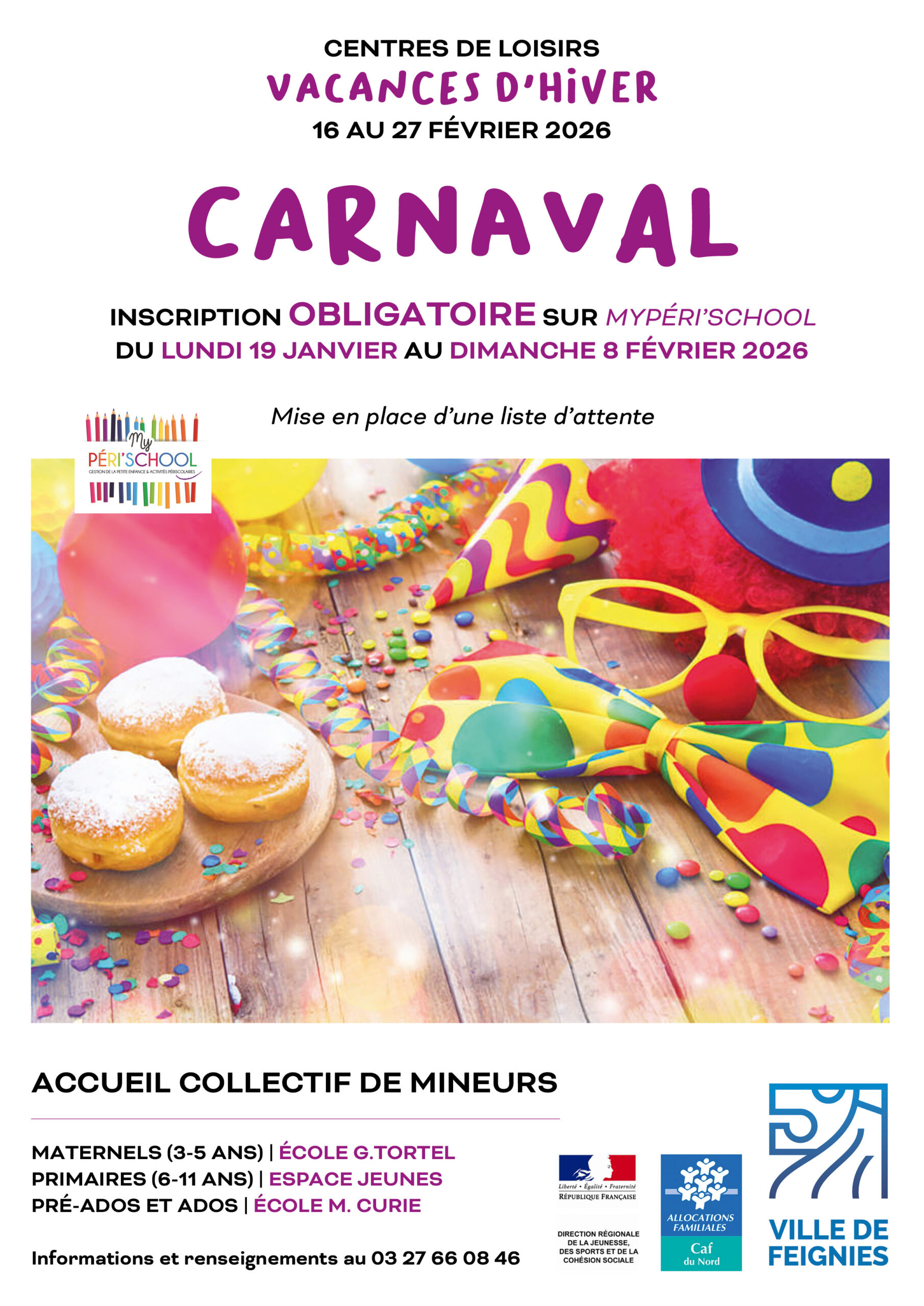 Inscription sur My Peri’School (limite d’inscription jusqu’au dimanche 8 février 2026), renseignements au Centre Émile Colmant au 03 27 66 08 46.